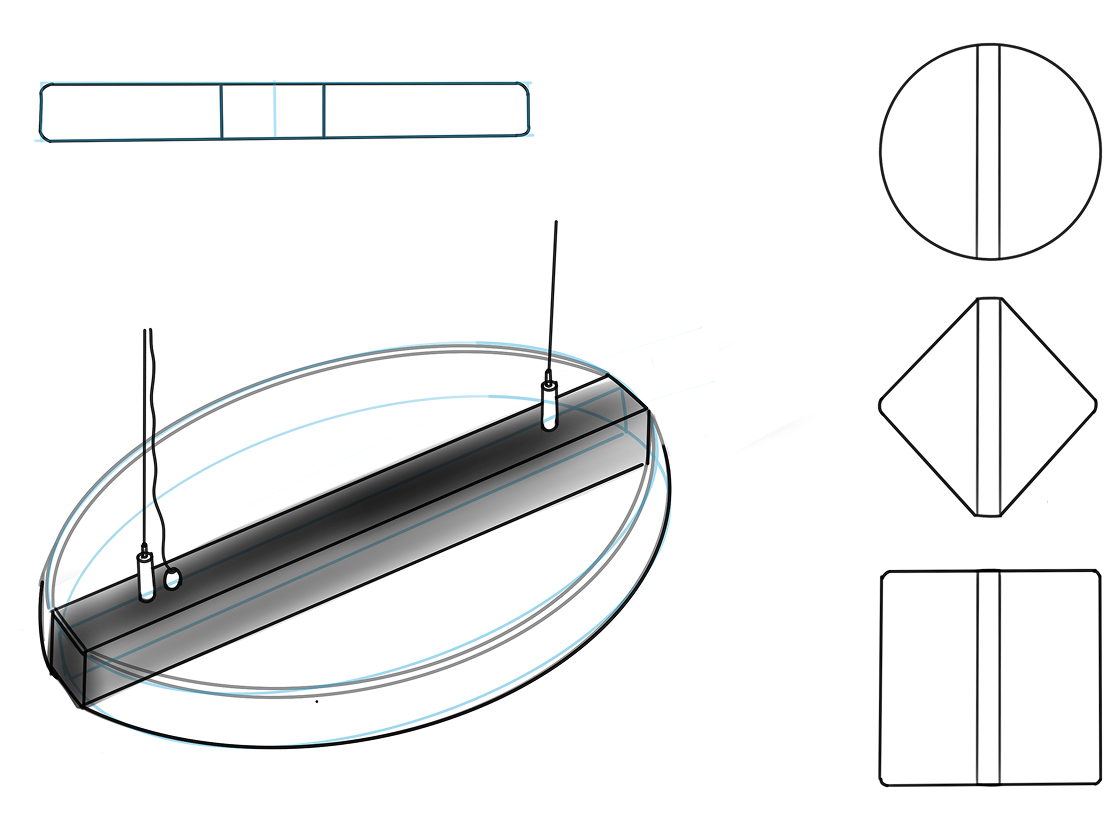 Three different forms were explored for the shade by having it wrap around a centered and linear light source that could hang by two points to maintain its balance.