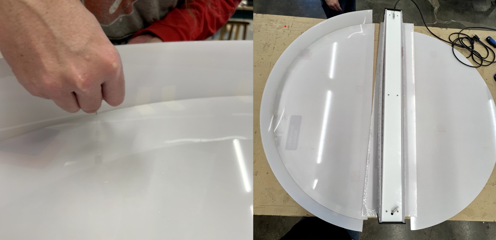 The final design was prototyped and tested through every step from production to installation. White and black painted aluminum make up the metal housing, and wet laminated PETG (polyethylene terephthalate glycol-modified) is used for the shade enclosure.