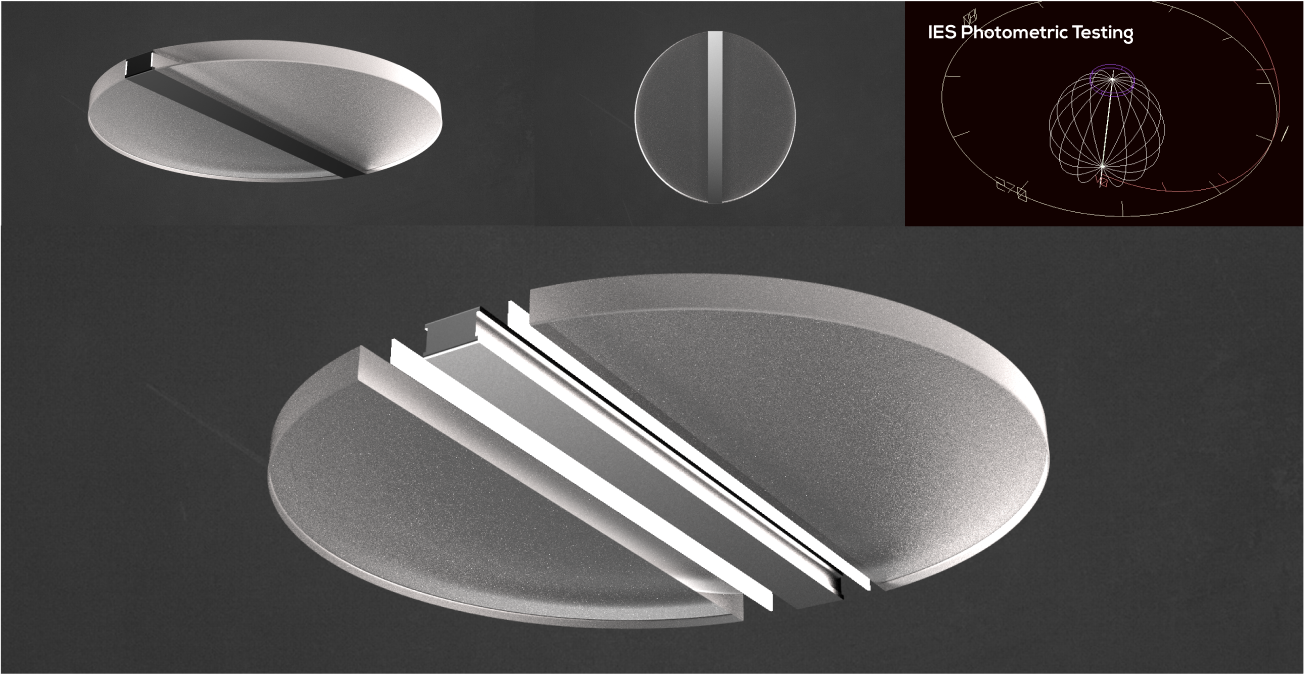 Multiple CAD iterations were utilized to find the best way to achieve the desired lighting effect. Digital rendering and IES photometric testing allowed the designers to predict the fixture’s light output and analyze how the light would behave within the circular shade enclosure.